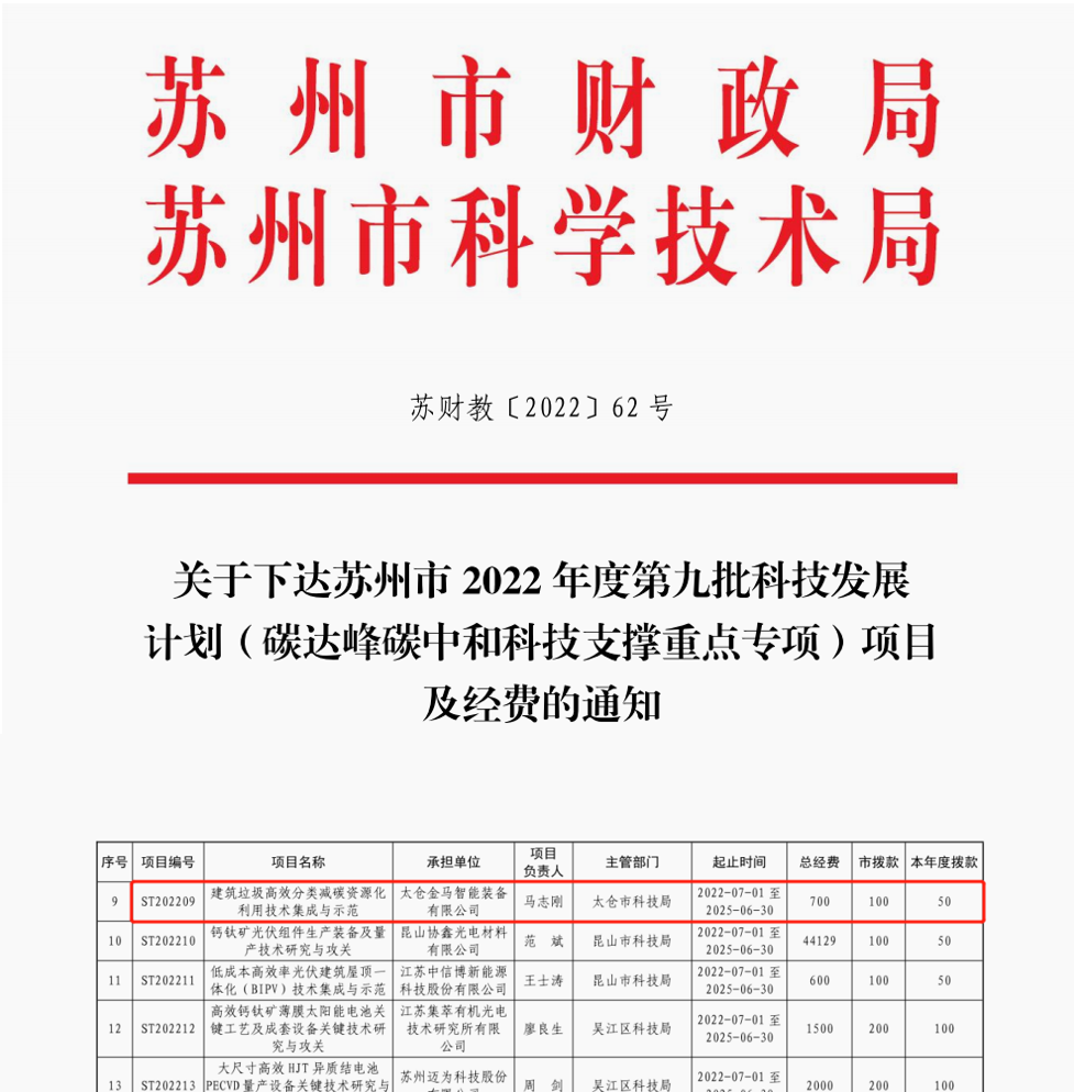 Recently, Suzhou issued a key special project document for carbon peak and carbon neutrality science and technology support, and the project of "Integration and Demonstration of Construction Waste Efficient Classification, Carbon Reduction and Resource Utilization Technology" undertaken by Goldenma Equipment, the parent company of Vancen, was successfully approved, becoming the first enterprise in Suzhou to use carbon reduction and carbon sequestration technology in the field of solid waste recycling.
